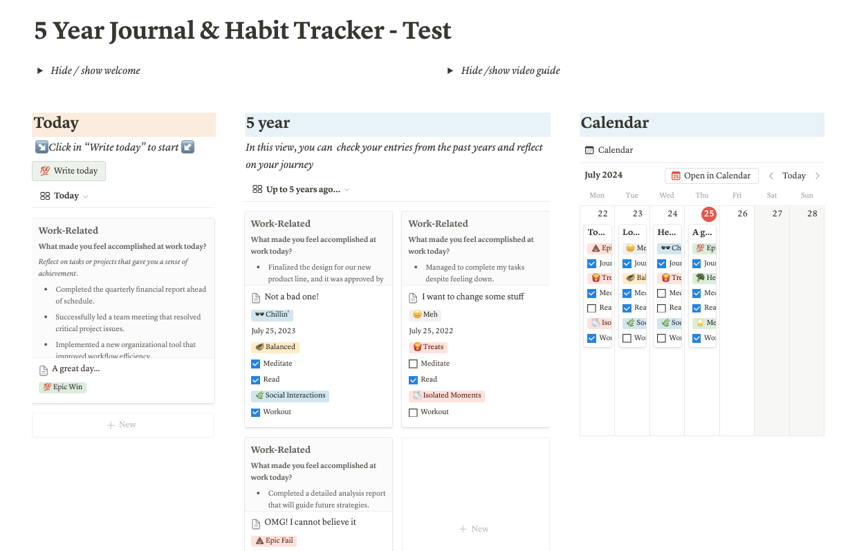Unlock your personal growth with the 5 Year Journal & Habit Tracker! This Notion template helps you track daily habits, moods, and reflections. Revisit past entries to see your evolution over five years. Start your journey today and watch your progress unfold!